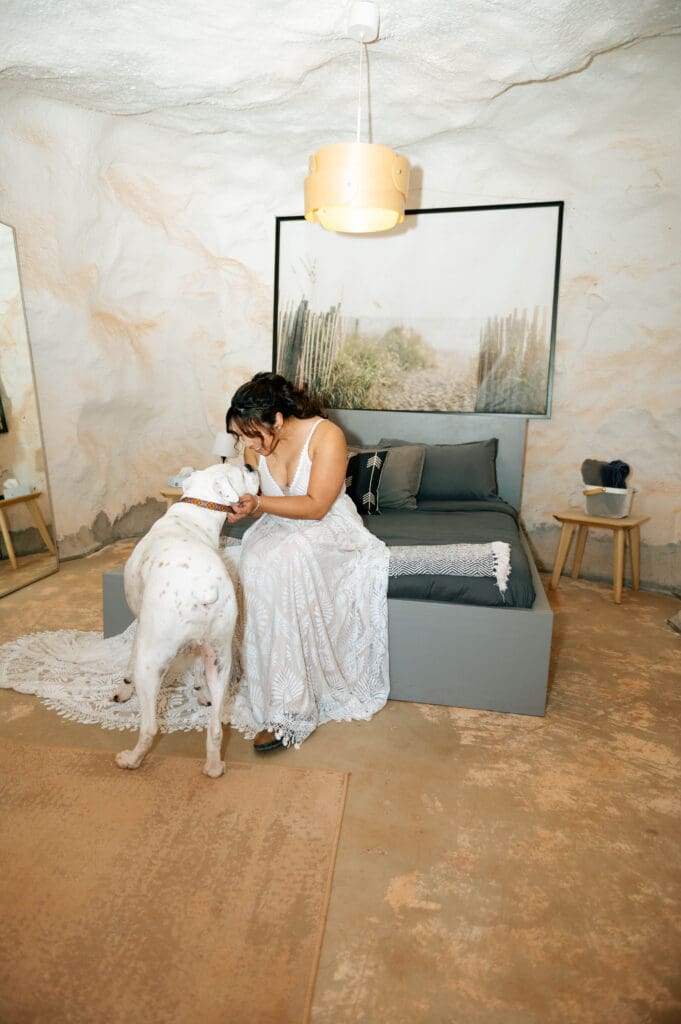 This is one of my favorites! Their private ranch is over 130 acres of seclusion surrounded by vast Public Lands, National Parks, State Parks and National Monuments. Perfect for reconnecting with the elements during your elopement day while still enjoying some comforts of home. inside the cave you’ll find a seating area, kitchenette and queen bed. there are shared bathroom/shower, high-speed wifi, AC, mini fridge, microwave, stove, sink & available BBQ.